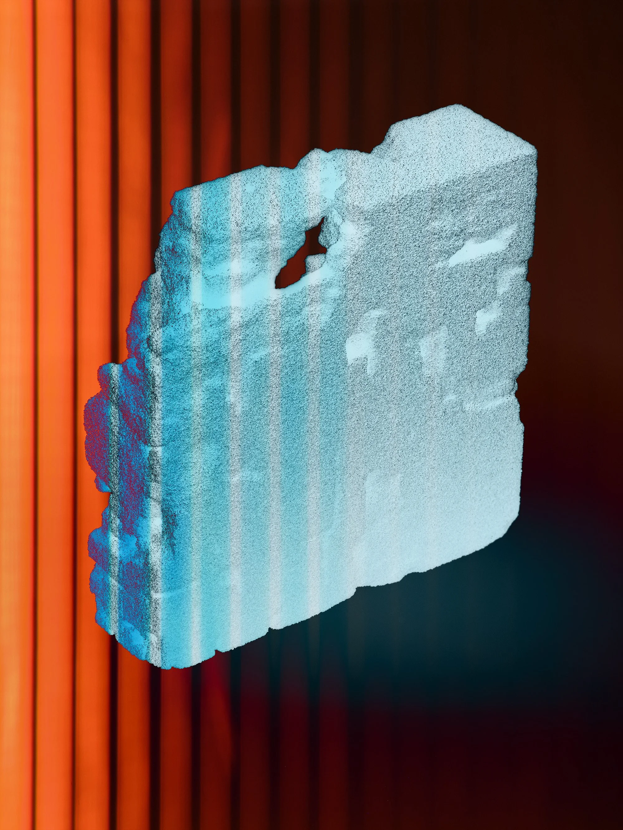 Sliced and subdivided, it reveals traces of geological time and artificial process, a fossil of hybrid origin.
